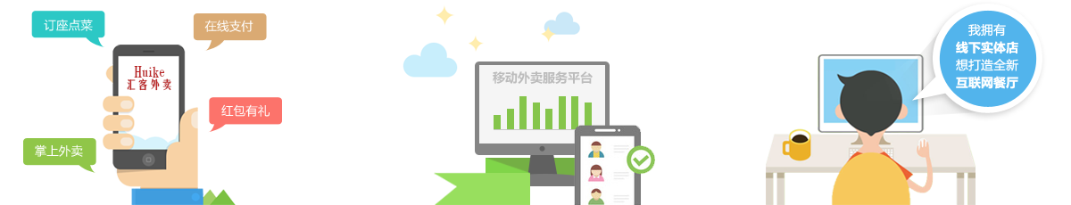 匯客外賣預(yù)訂系統(tǒng)是通過PC端網(wǎng)站、獨立手機(jī)APP、微信公共賬號來進(jìn)行服務(wù)的網(wǎng)絡(luò)外賣預(yù)訂平臺。