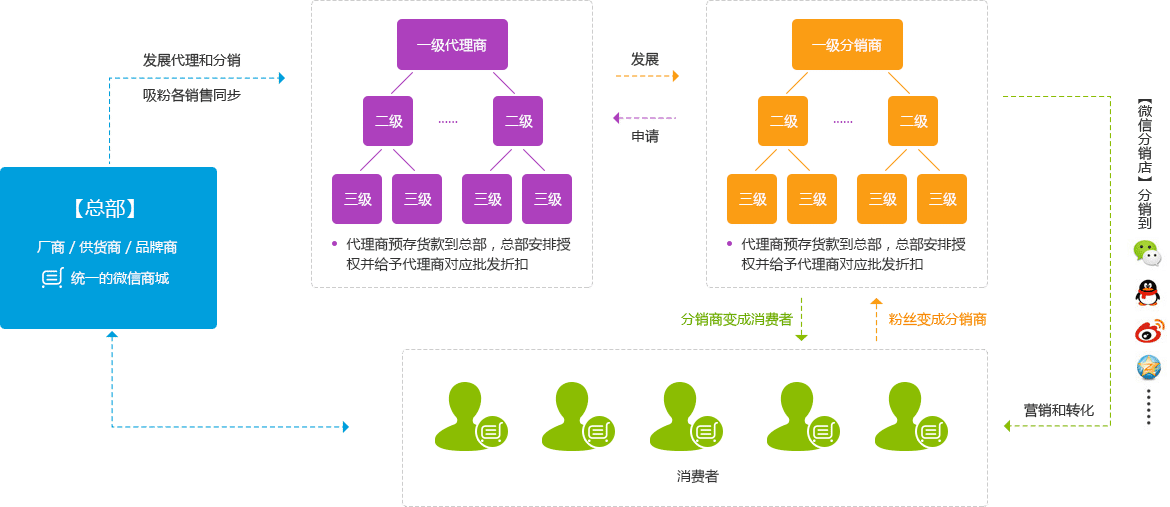 所有粉絲免費幫企業(yè)開分銷店,只要成交后給予分銷者相應的提成,企業(yè)零成本拓展無限銷售渠道。
