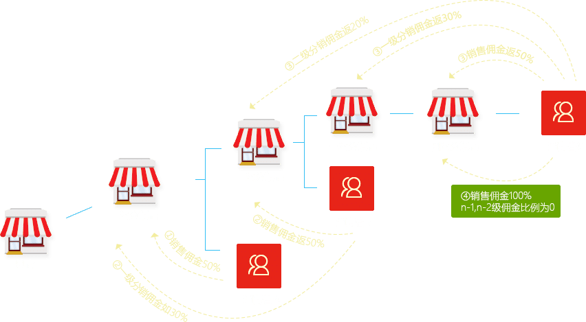 場景④:如果總部設置銷售傭金為100%,那么只有銷售成功的分銷店才有傭金;其上級沒有銷售成功,就不能得到分銷傭金。