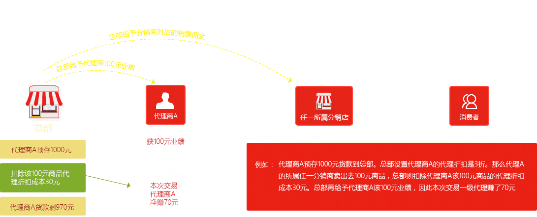 場景①:“消費者A”到“一級分銷店”購買100元商品,“一級分銷店”得到5元銷售傭金,其他5元由“總店”收??;